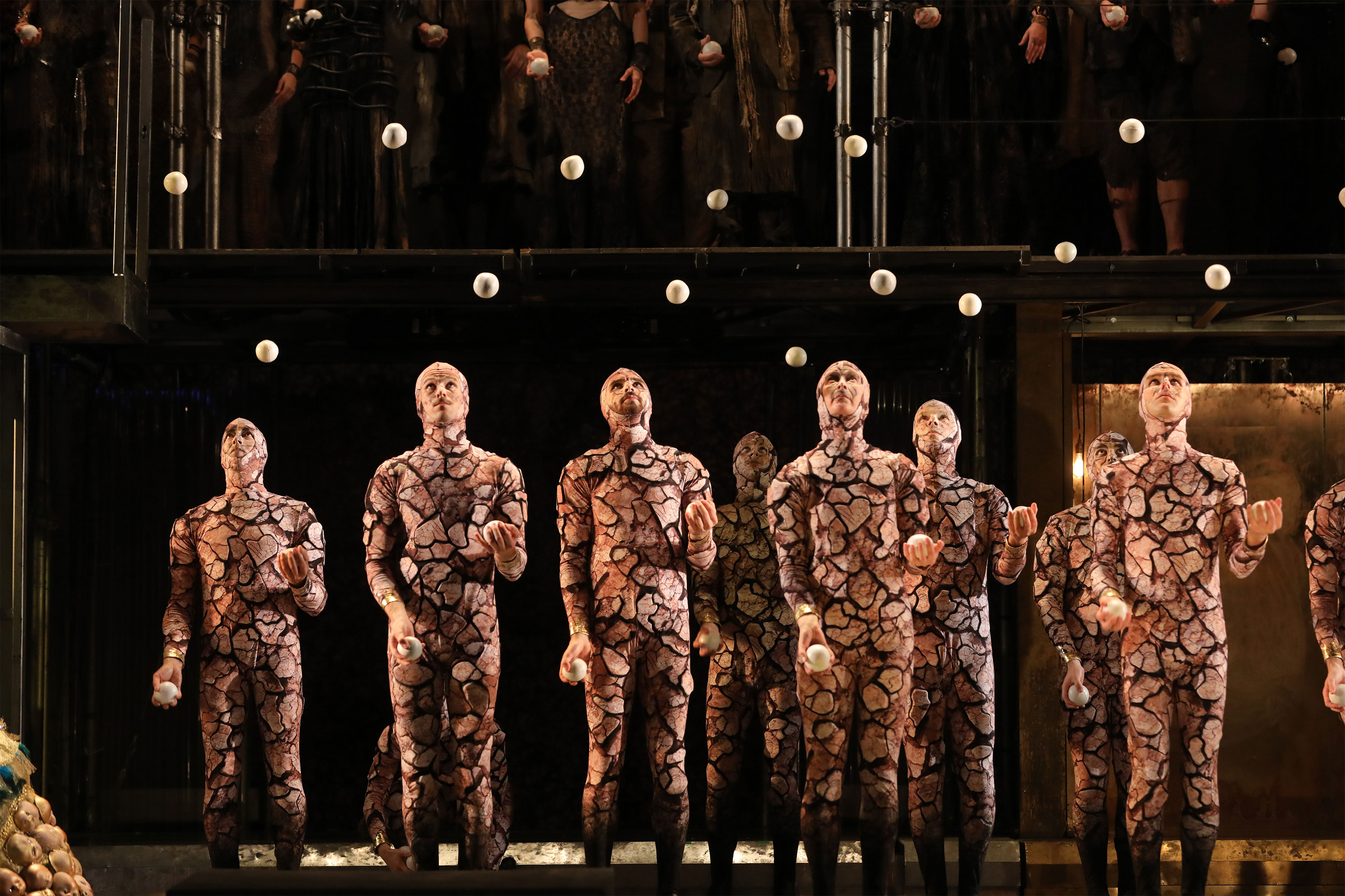 The earliest known record of juggling was created 4,000 years ago, a wall painting (above) in Tomb 15 of Egypt’s Beni Hasan cemetery complex near present-day Minya. The tomb belonged to Baqet III, a provincial governor during the later years of the Eleventh Dynasty of Egypt. It depicts female dancers and acrobats juggling up to three balls; one of them is juggling with her arms crossed. Brooklyn Museum associate curator Dr. Robert Bianchi has suggested that the tomb’s depiction of jugglers may be “an analogy between balls and circular mirrors, as round things were used to represent solar objects, birth and death.” “While there is a symbolic connection to these first known representations of juggling, the juggling featured in this production of Akhnaten has a purposely equivocal role,” says Sean Gandini, choreographer of the juggling ensemble. “In some ways, the objects are alter egos to the characters’ ideas: miniature globular deities, bouncing thoughts, desert sand. On another level, I feel like the juggling has a structural relation-ship to Philip Glass’s score. We have tried to make the patterns relate to the music and create a dialogue with it. We tried to create a series of little ephemeral geometries that hover visually around the music.”