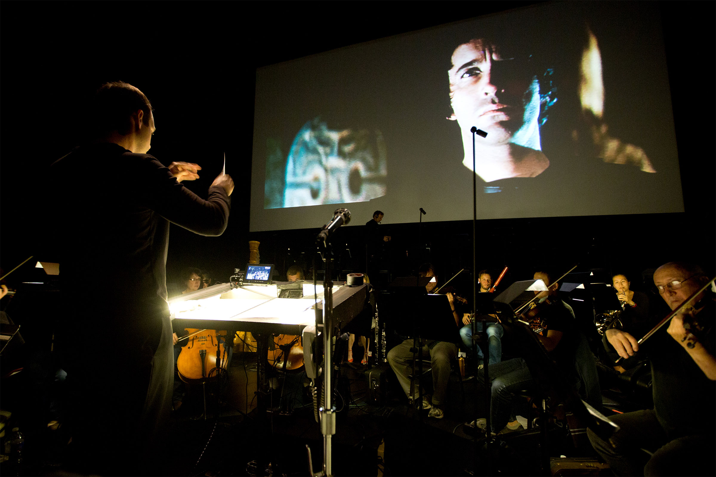 LA Opera's 2015 presentation of Hercules vs Vampires, with Reg Park (Hercules) and Christopher Lee (King Lycos) onscreen (photo: Craig T. Mathew)