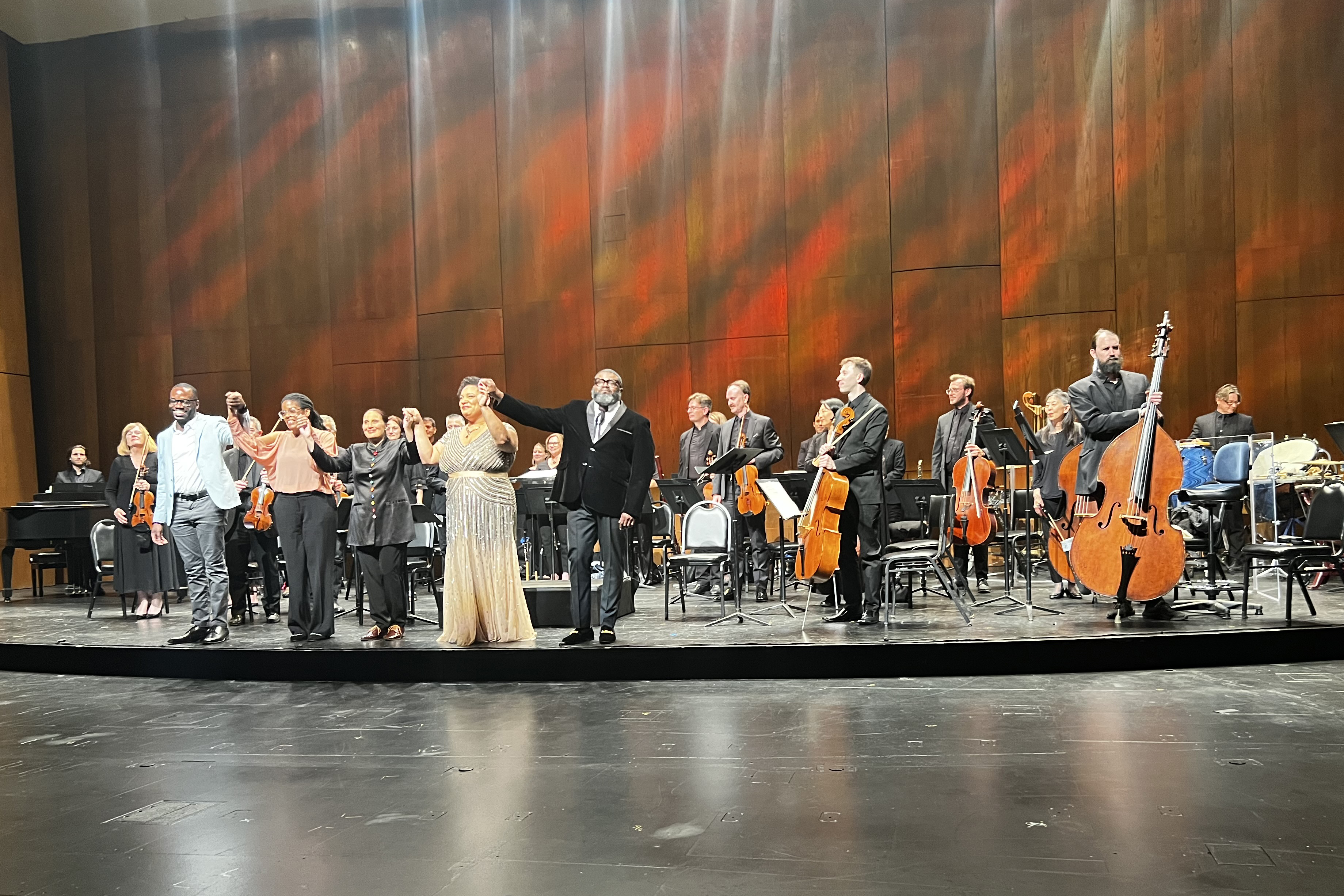 Lina González-Granados (in black, center of front row) at the curtain call for LA Opera's "Fire and Blue Sky" in 2024 (Photo: courtesy of LA Opera)