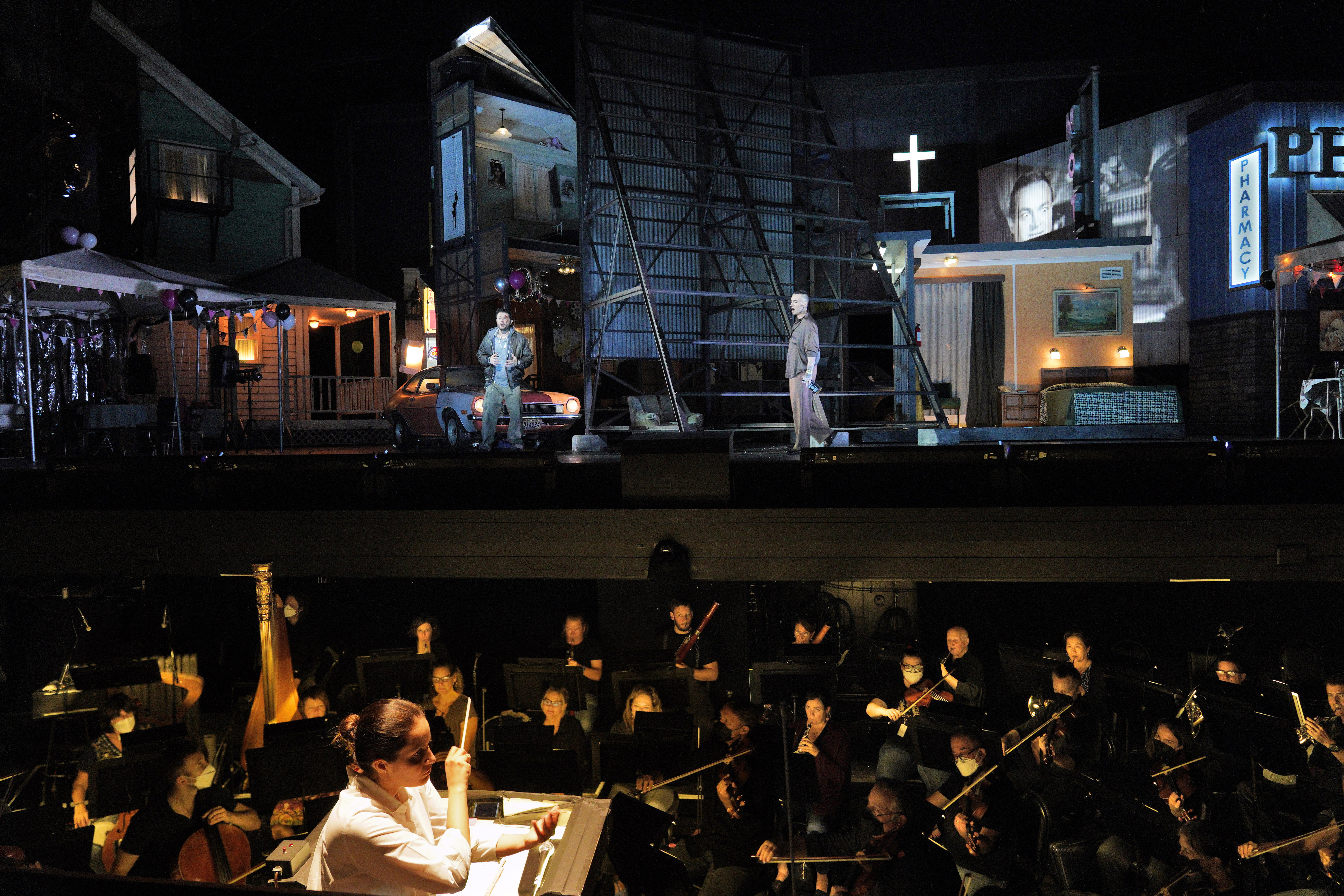 Lina González-Granados (at right) conducting LA Opera's 2023 presentation of "The Rape of Lucretia" (Photo: courtesy of LA Opera)