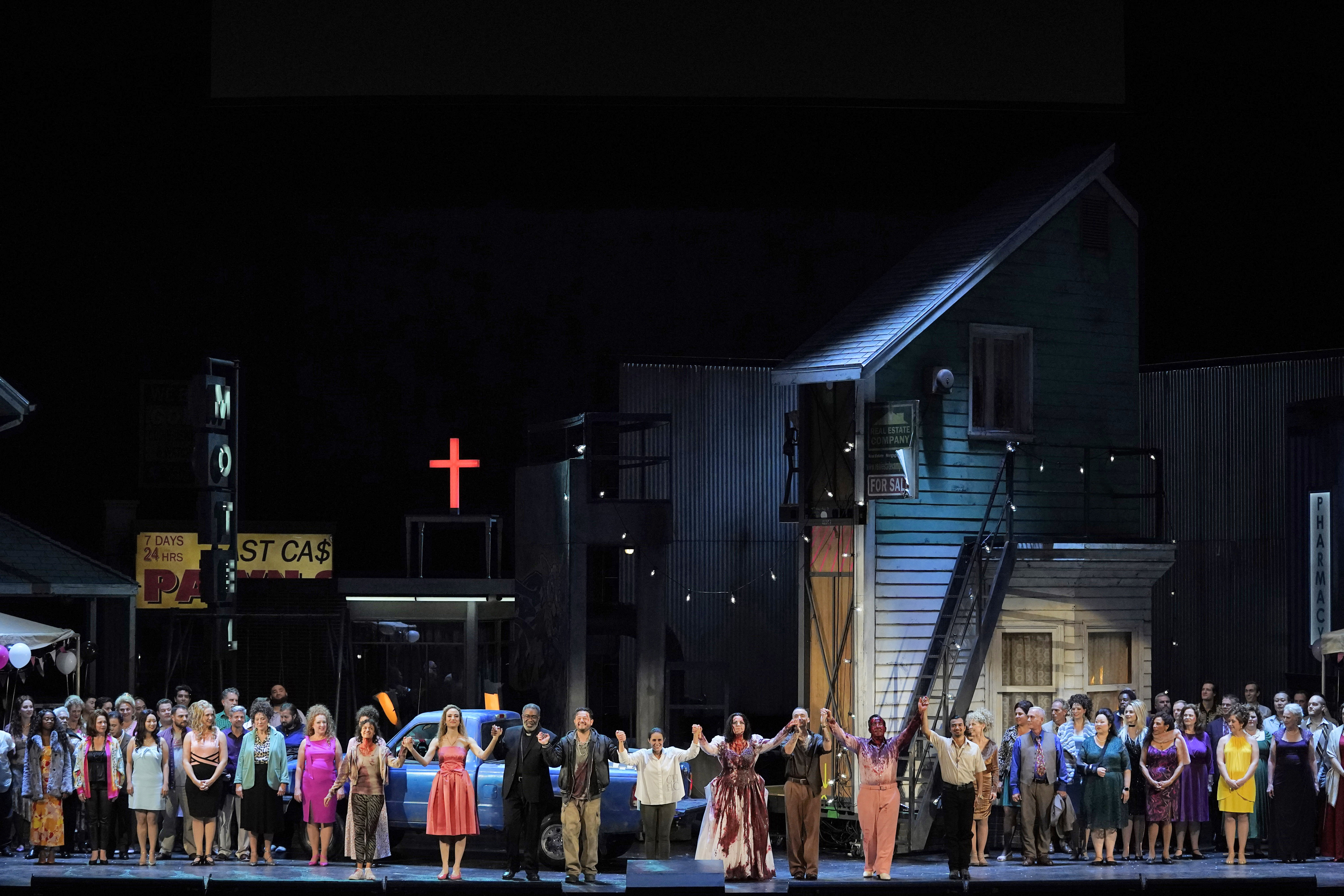 Lina González-Granados (center, in white top) at the curtain call for LA Opera's 2022 production of "Lucia di Lammermoor" (Photo: Cory Weaver)