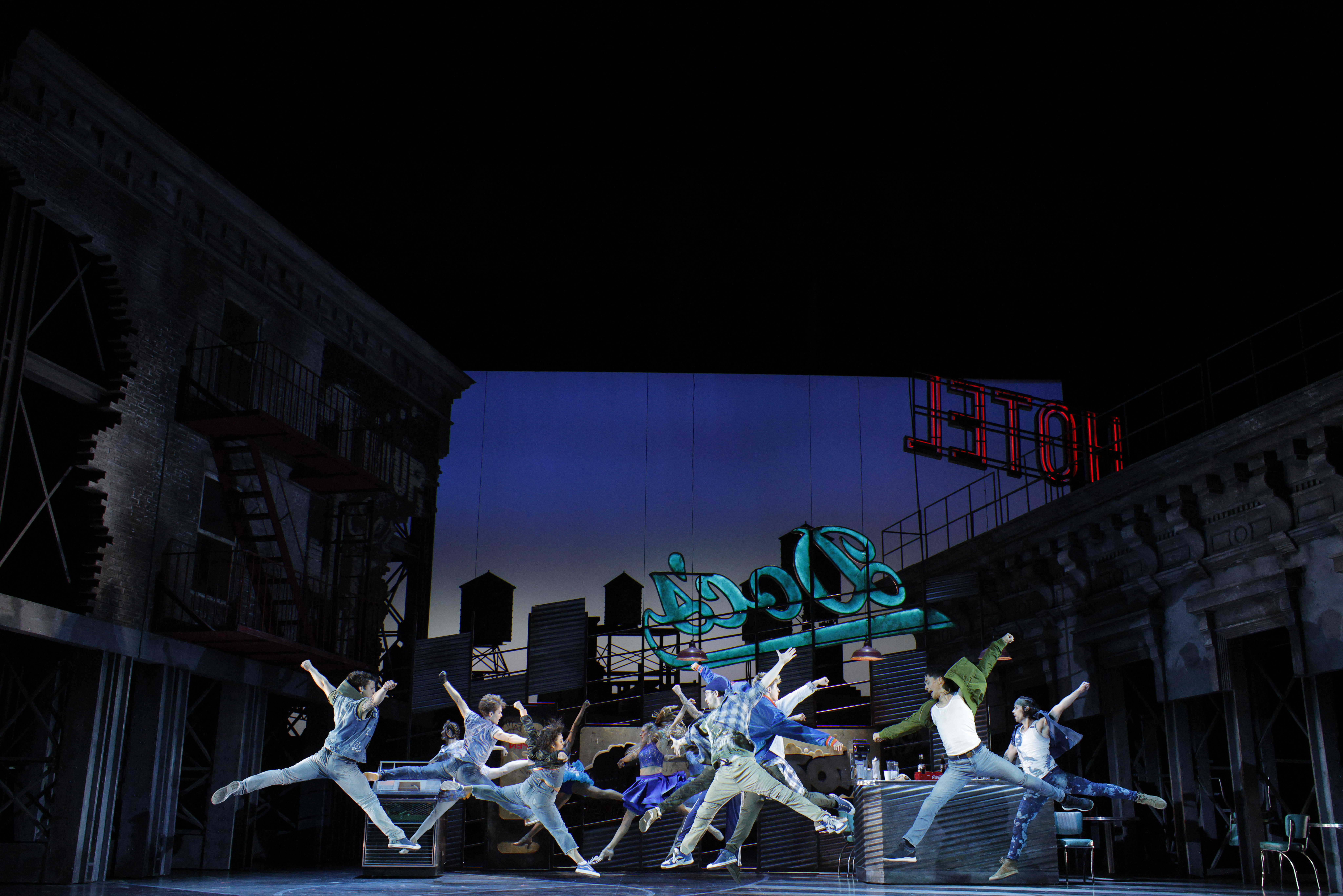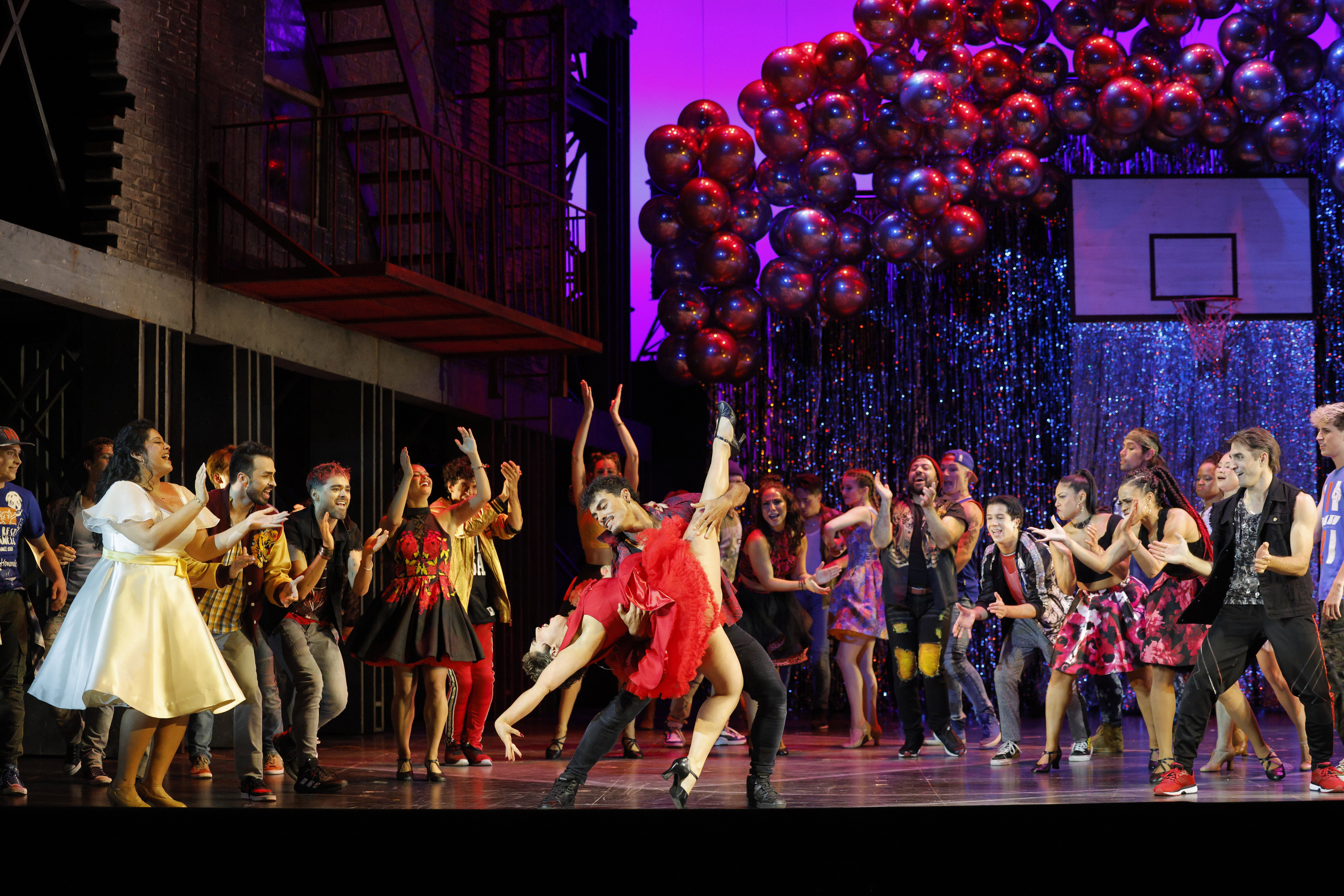 At center, Amanda Castro as Anita and Yurel Echezarreta as Bernardo, with Gabriella Reyes as Maria (in white) at far left, in LA Opera's 2025 production of West Side Story. (Photo: Cory Weaver)