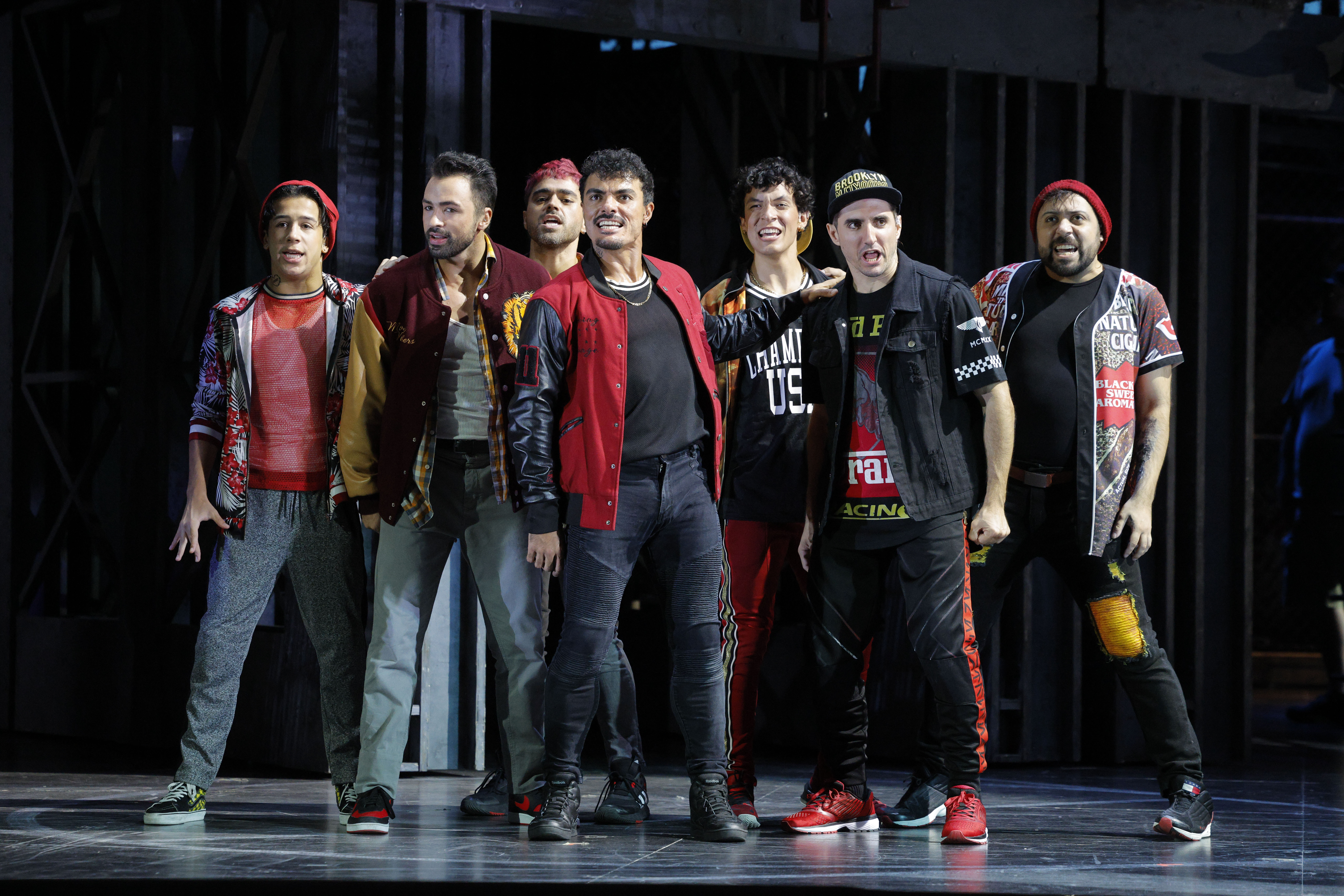 Yurel Echezarreta as Bernardo (front, center) with the Sharks. Left to right: JT Church (Nibbles), Juan Miguel Posada (Chino), Mark Ibañez (Indio, in rear), Yurel Echezarreta (Bernardo), Nathan Bravo (Anxious), Lester Gonzalez (Pepe) and Edgar Lopez (Luis). (Photo: Cory Weaver)