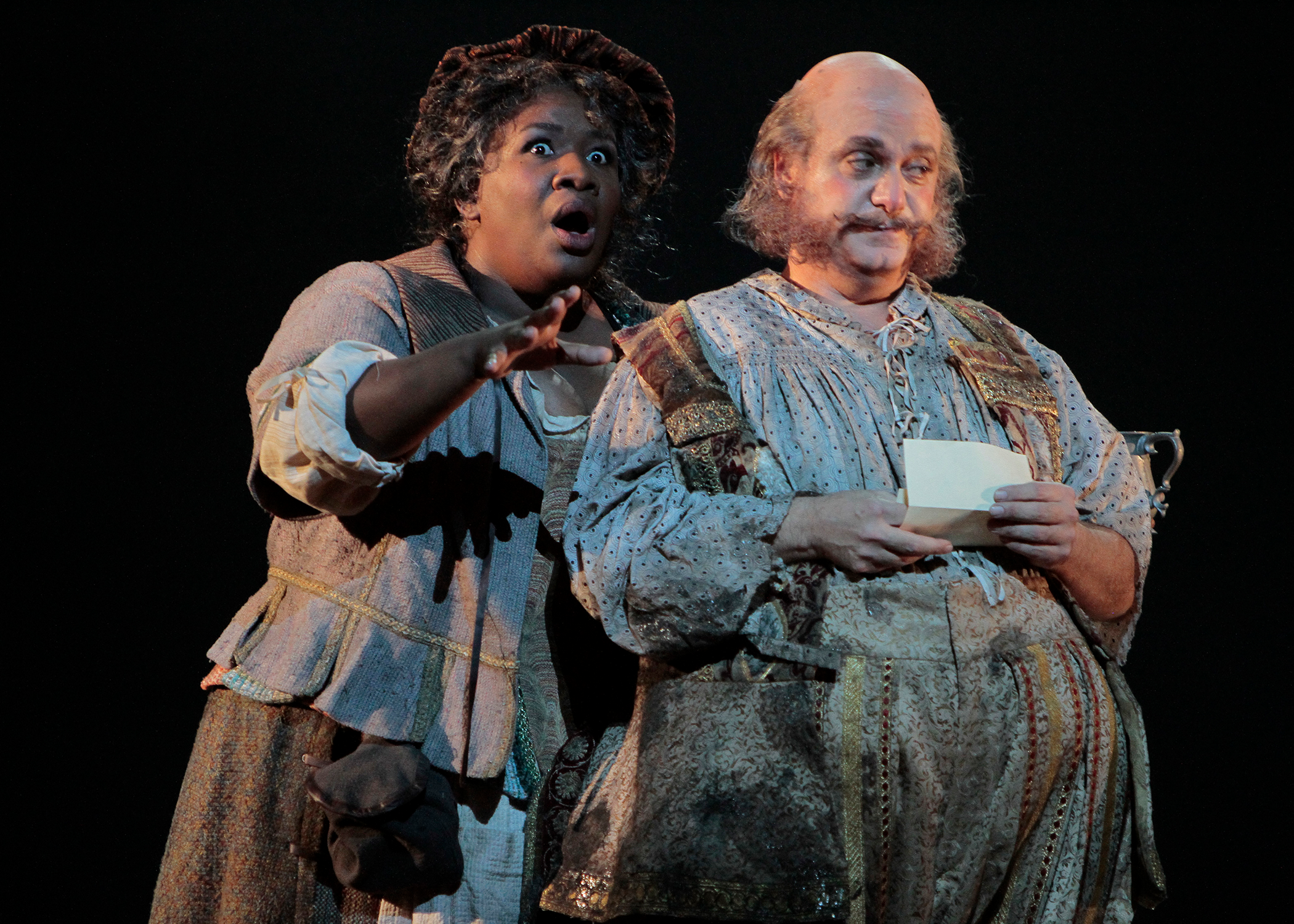 In the next scene, the four women compare Falstaff’s love letters, reveling in his over-the-top verbiage. This moment reaches its peak with Alice’s solo reading of the line “Ma il viso tuo su me risplenderà come una sorella sull'immensità” (Your face will shine upon me like a star in the vast firmament). Her grandly arching vocal line is a lighthearted counterpart to the intensely emotional melodies bestowed on many of Verdi’s earlier heroines.