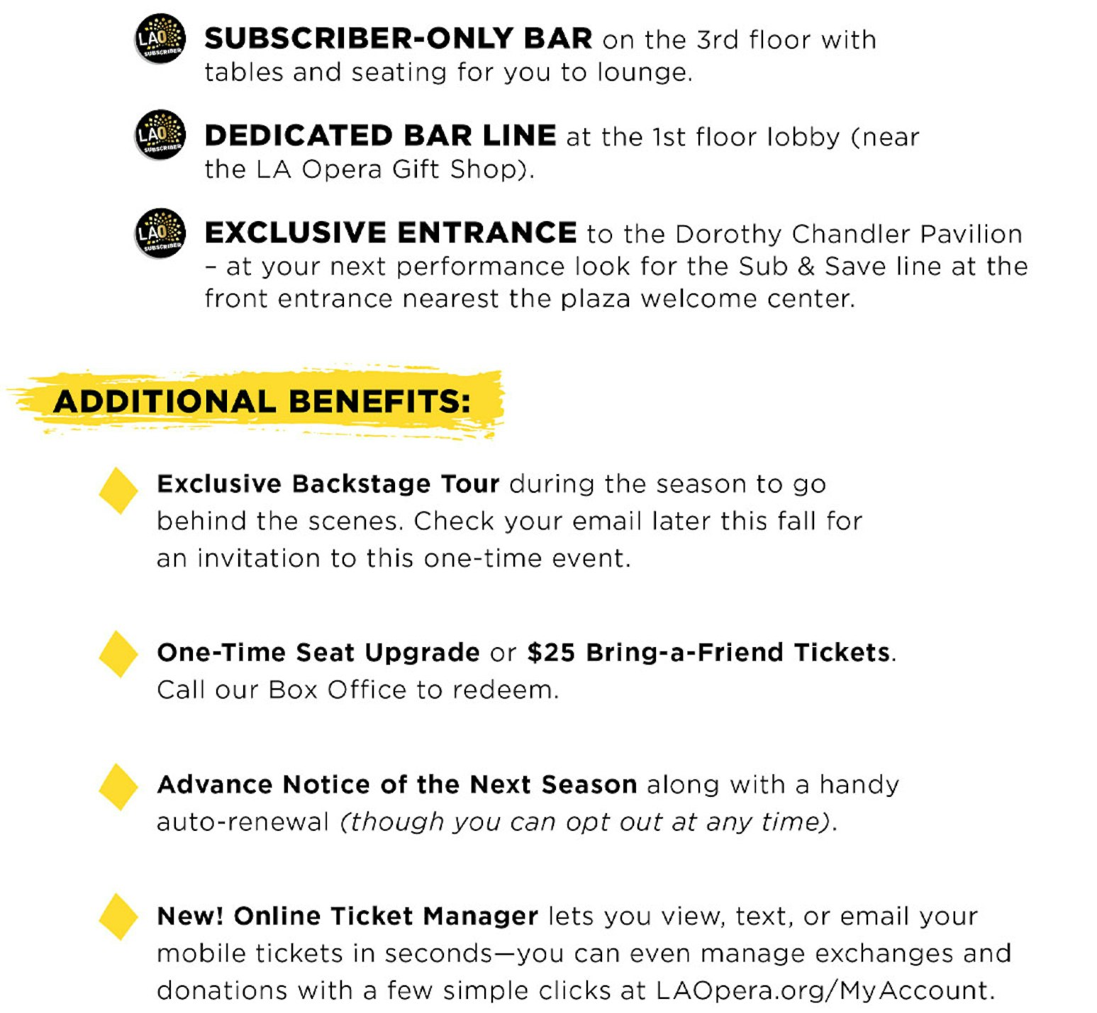 As a Subscribe & Save member, you will receive priority entrance into the Dorothy Chandler Pavilion and priority service at concession stands via a pin that we will issue you (don't worry, it's magnetic). Please note that venue logistics may occasionally limit your access to these benefits. You will also be invited to backstage tours and special events throughout the season, subject to artist availability and backstage access per production.