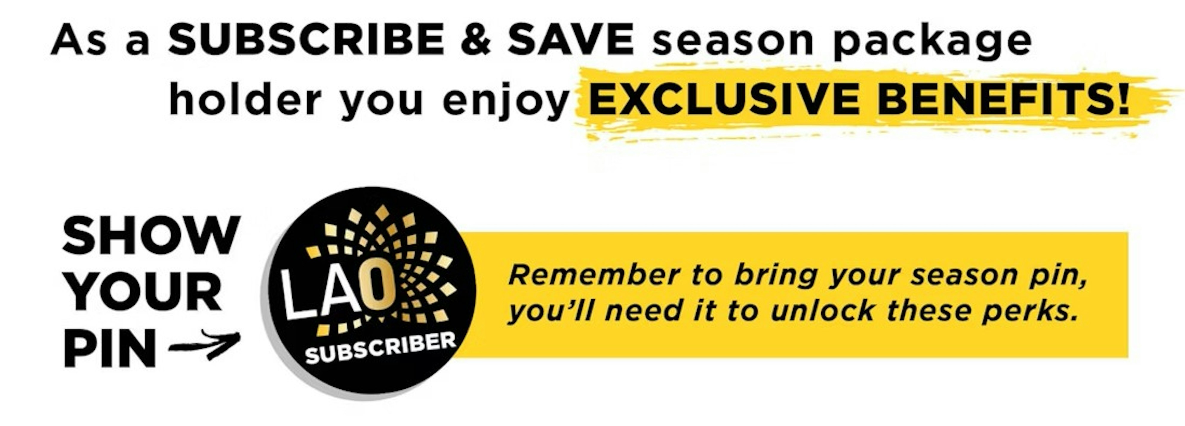 As a Subscribe & Save member, you will receive priority entrance into the Dorothy Chandler Pavilion and priority service at concession stands via a pin that we will issue you (don't worry, it's magnetic). There may be times when the structure of the venue may limit your access to this benefit. You will also be invited to backstage tours and special events throughout the season depending on artist availability and backstage access per production.