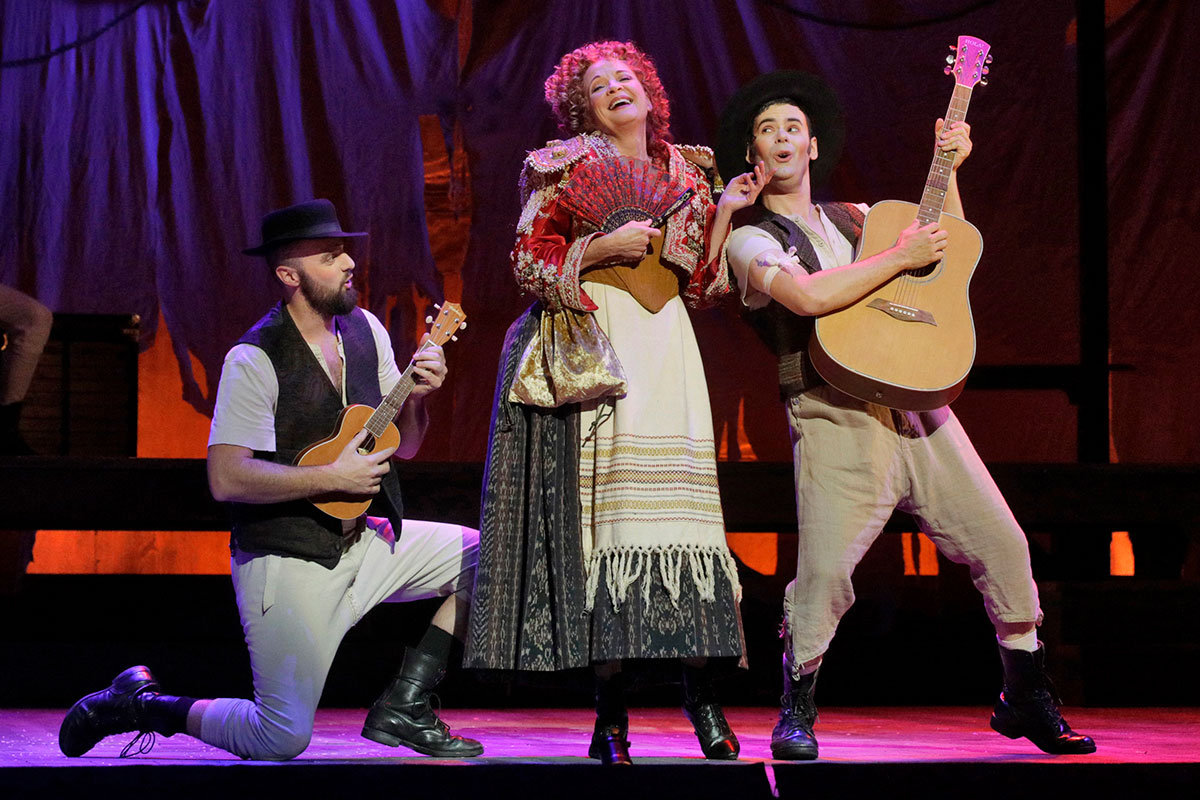 A scene from LA Opera's 2018 production of Candide. Shown: Jack Swanson as Candide, Erin Morley as Cunegonde and Christine Ebersole as the Old Lady. (Photo: Ken Howard)