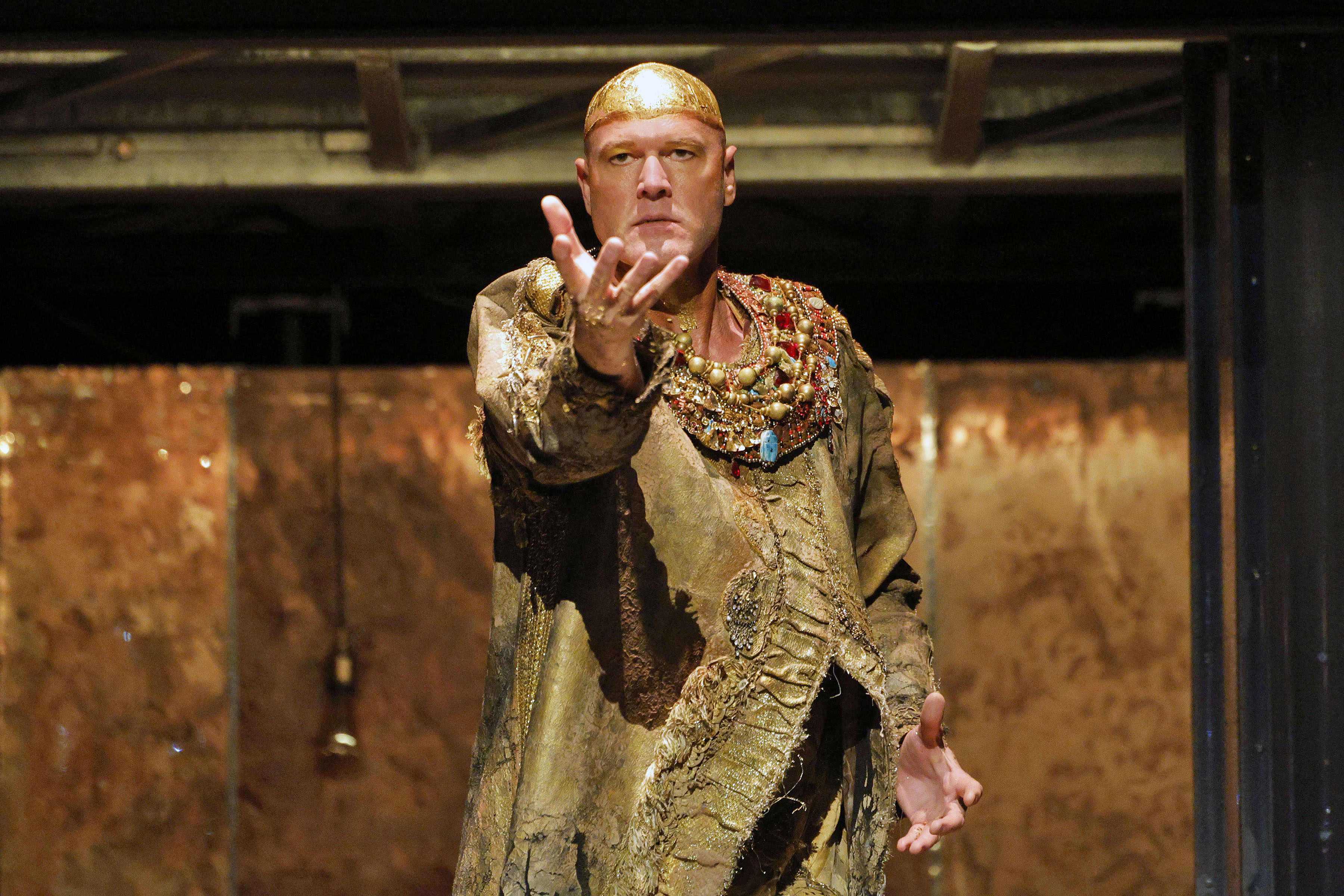 John Holiday as Akhnaten, with Vinicius Costa (left) as Aye and Hyungjin Son (right) as Horemhab